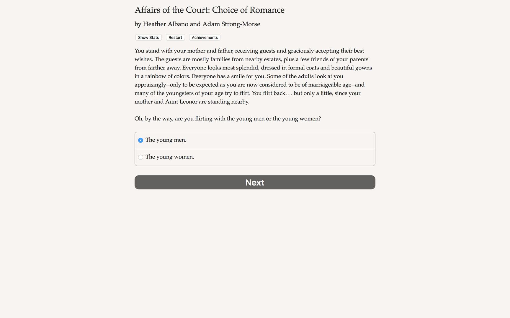 Affairs of the Court: Choice of Romance представляет собой интерактивную фэнтэзи новеллу от Хизер Альбано и Адама Стронга-Морса. Окунитесь в судовую политику и измените ход истории, или продолжите роман, который удивляет королевство до основания!