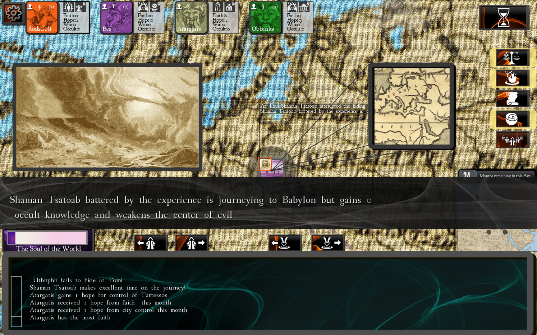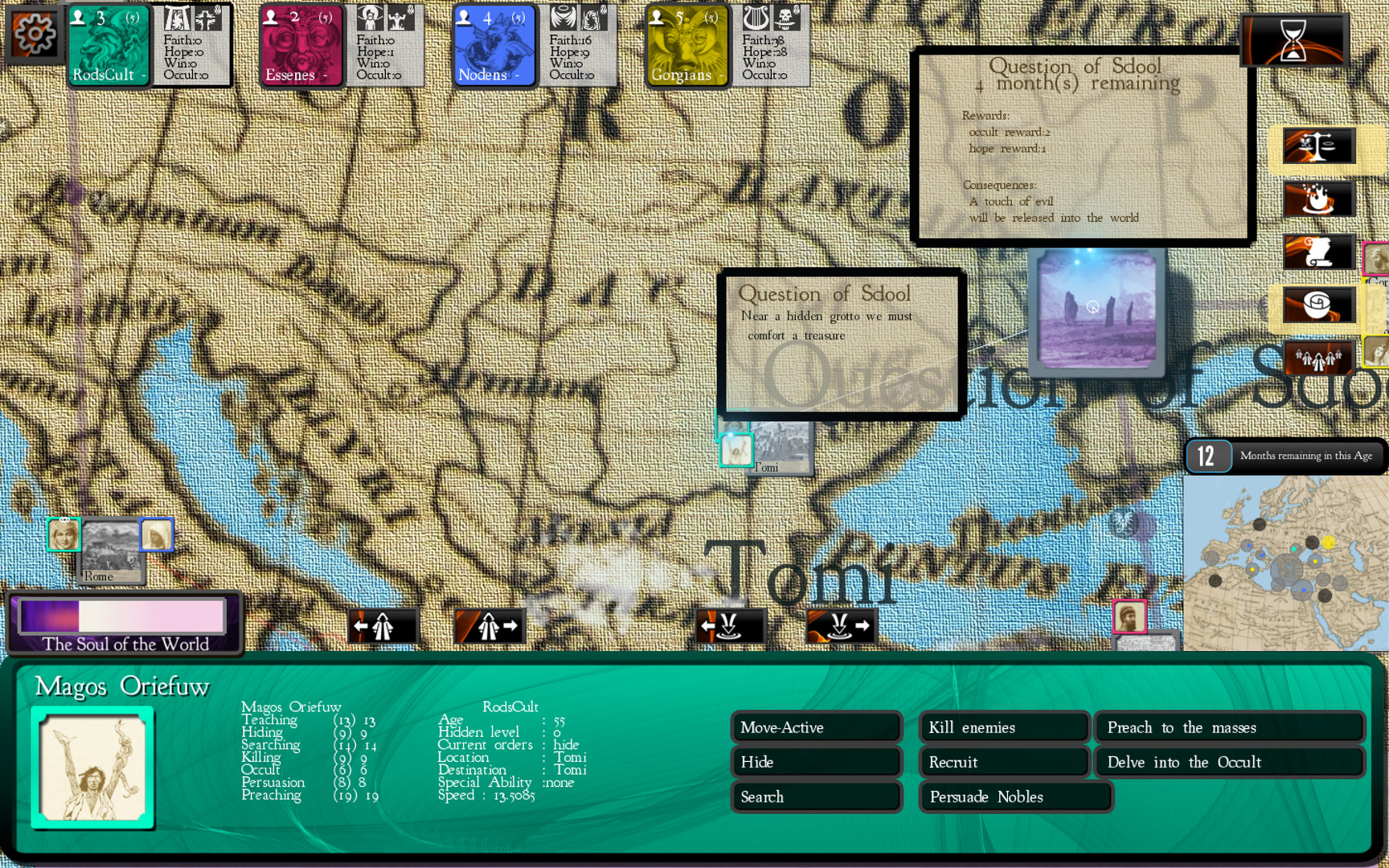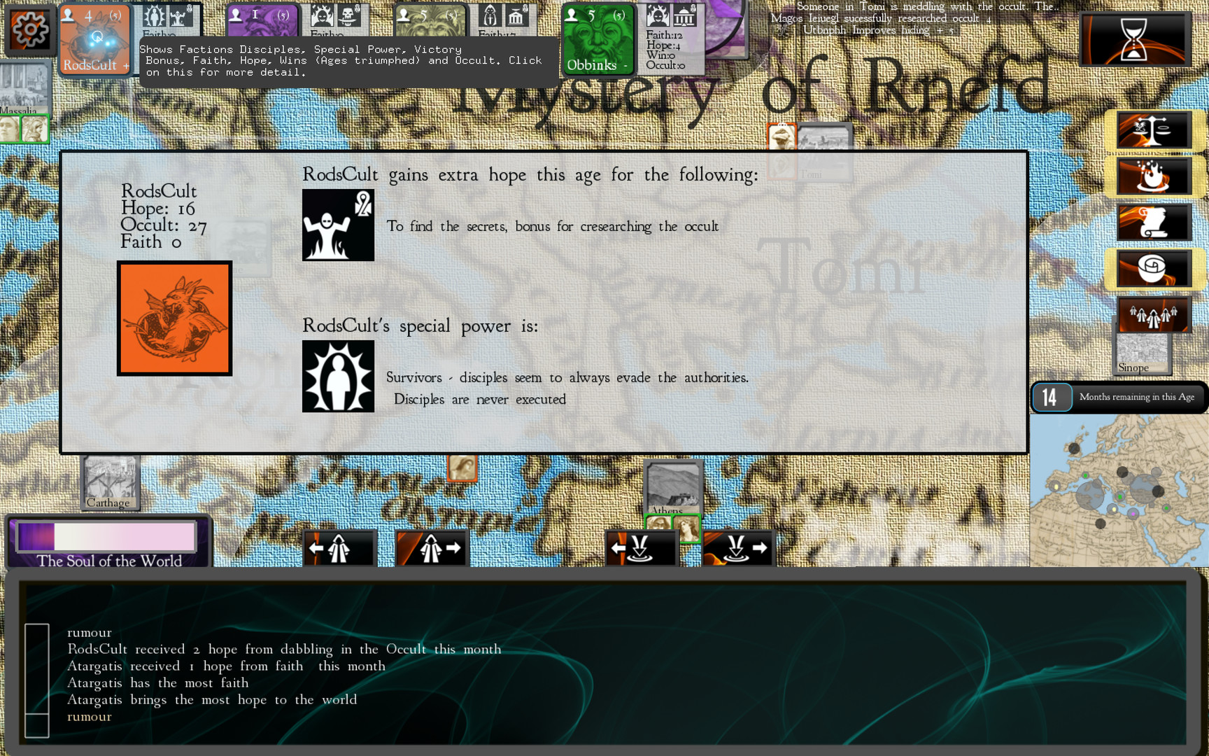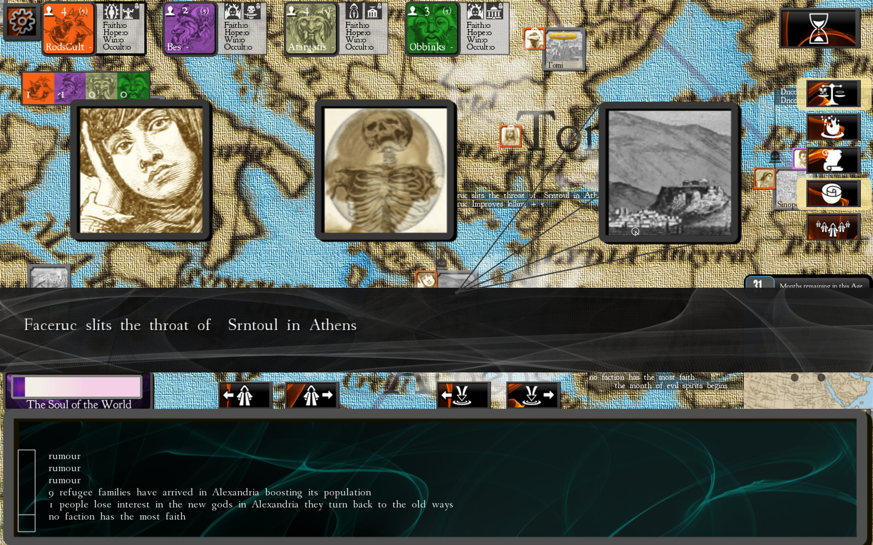 Cults and Daggers - религиозная стратегическая игра, где можно создать собственную религию и бороться с миром за нее. Действие в игре происходит в период между смертью Будды и рождением Христа. Шпионы, убийства, противоборствующие силы, мученики, пророки и богохульники - все есть здесь в этой игре.