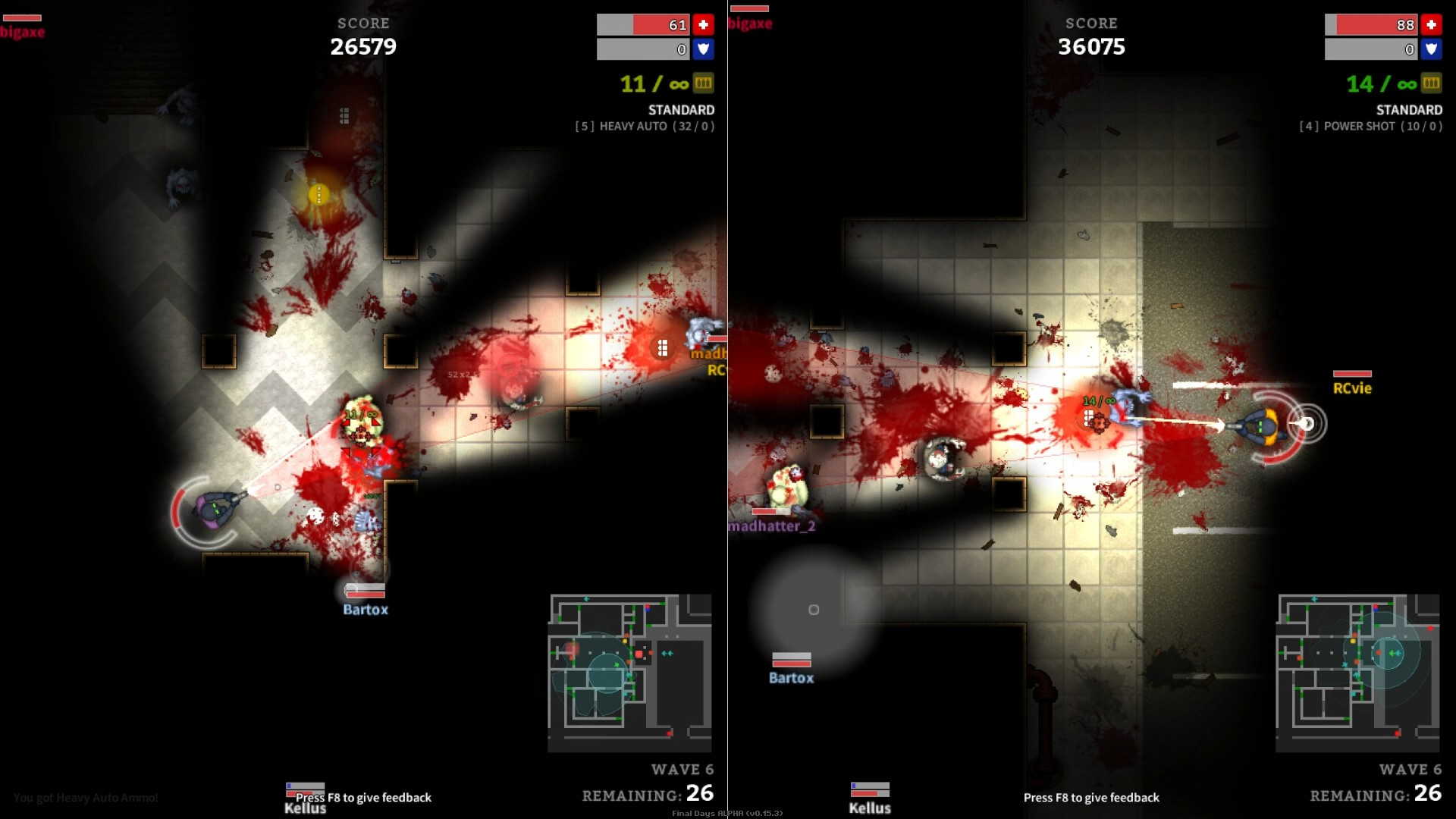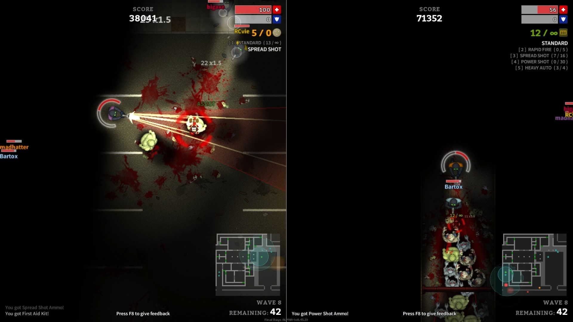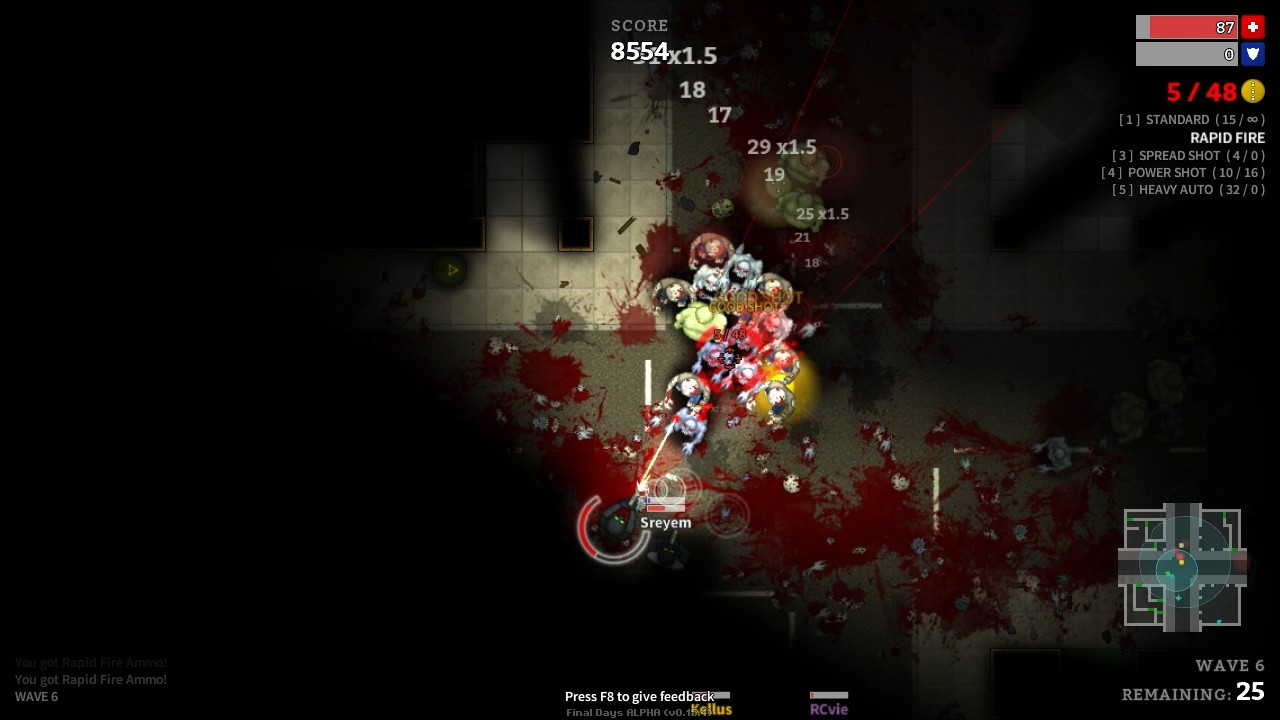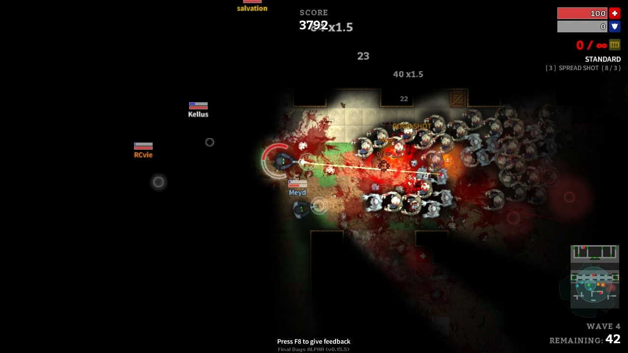 Final Days являет собой интенсивный двухмерный многопользовательский шутер в пост-апокалиптическом мире от независимой команды +7 Software. По сюжету этой игры, грязная война оставила большую часть населения мутированной и с ужасной жаждой крови. Собирайтесь вместе с остатками человечества и сражайтесь за свое выживание в Final Days! В этой игре вы сможете играть, как в одиночку, так и в компании своих друзей и знакомых, или же просто с другими игроками со всего мира.