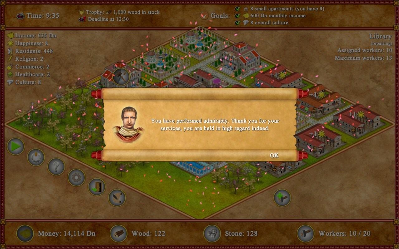 Вы будете вознаграждены деньгами, славой и честью. Вы можете пройти свой путь к вершине в комплексном режиме кампании или вы можете создавать и воспроизводить свои собственные сценарии. Постройте десятки домов в римском стиле, сооружений и других зданий. Доступны трофеи и награды! Выигрывайте призы в 24 уникальных сценариях кампании.