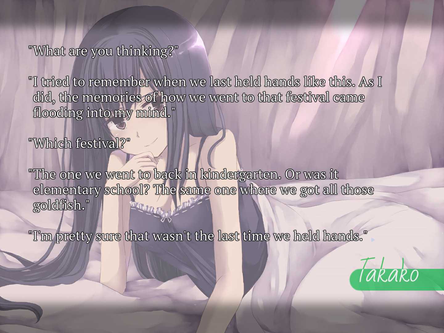 Нарасаки Хибики, подруга Сачико и психиатр занимающийся исследованиями работы человеческих воспоминаний. Нарасаки была одноклассницей Сачико в младших классах, но как только были зачислены в разные средние школы, они отдалились друг от друга. После того, как Нарасаки узнала, что Сачико испытывает галлюцинации, она берет на себя ответственность за лечение своей старой подруги и одноклассницы. И наконец третий персонаж романа, Такако, бывшая любовница Сачико, которая забывает свое прошлое, включая то, как и почему эти две женщины разошлись, ни смотря на то, что они вместе с детства. Такако производит впечатление женщины застрявшей в своем детстве. Она влюбилась в Сачико с первого взгляда, когда они впервые встретились в возрасте до пяти лет. Такако обнаруживает, что страдает от амнезии развития, болезнь, которая резко снижает ее способность вспомнить многие из ее воспоминаний. Все трое живут в разных мирах, но преследуют одну и ту же цель. Чтобы отделить истину от иллюзии. Чтобы разобраться в своих собственных жизнях. Любите подобного рода игры-романы? Купите ключ SeaBed у нас на сайте, и вперед играть.