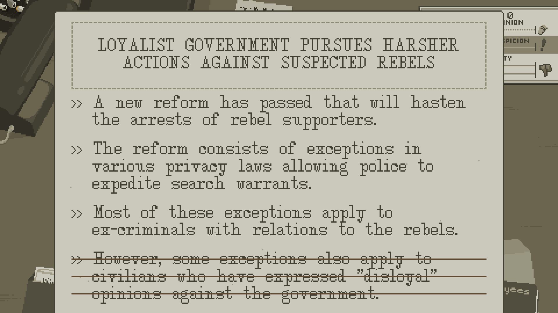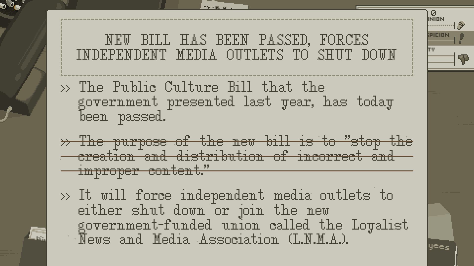 The Westport Independent - это симулятор цензуры, которая происходит в повседневной жизни в нашей стране. Вы – редактор одной из последних независимых газет и ваша задача – удалять и редактировать статьи, которые влияют на мнение людей.
